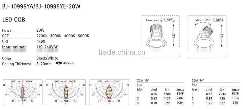 20W 15W LED COB Wall Washer Downlight Architectrual Lighting Cutout 95mm
