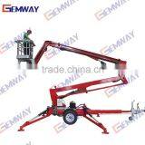 Tow behind cherry picker for sale with features of large work range and easy operation, provides a convenient, easy and reliable access to the height you want to reach, it can easily lift the person and tools with the max capacity 200kg. It is very popular solution for aerial work, so this product has very good market.