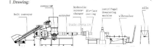 This type of recycling line is composed of loader, agglomerator ( or crusher), extruder, hydraulic screen changer, mould, water ring cut system, dewatering collecting system, air blowing and storing system etc.