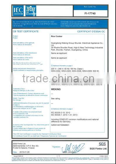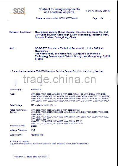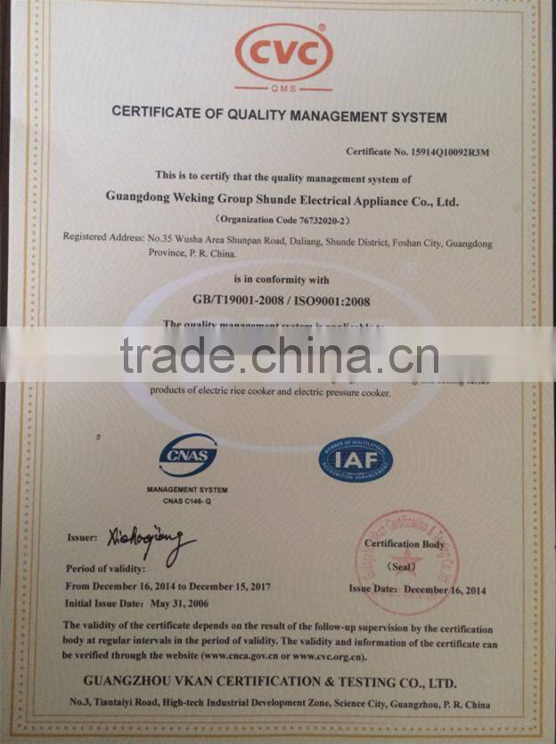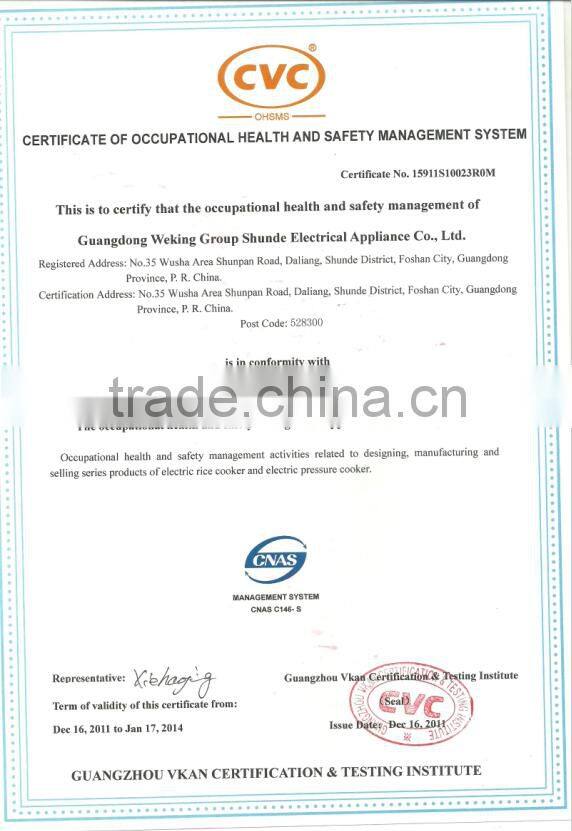 China electric rice cooker industry national standards committee as the governing unit, Weiwang has been working on innovation and development of world class standard products. In 2007, Weiwang electric cooker was "Chinese famous brand" title; electromagnetic oven relay cooker also obtained "national inspection free products". In 2009, Guangdong weking Group Limited has been identified as "A Well-Known Trademark in China". Excellent product quality has been recognized by many authoritative organizations, access to a variety of world-class certification: such as the ISO9001 international quality system certification, China 3C certification, Germany, the European Community GS, CE, LVD and other certification.