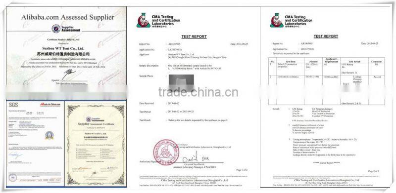 Suzhou WT Tent Co., Ltd. is a combination of trading agency and manufacturer located in Suzhou, China. We own specialized workstations, modernized production line and advanced technique. Our main products include premium marquees, big party tent, large exhibition tent, pagoda, summer gazebo, folding tent, instant pop up tent, which are widely exported to American, European, Middle East and Oceania markets