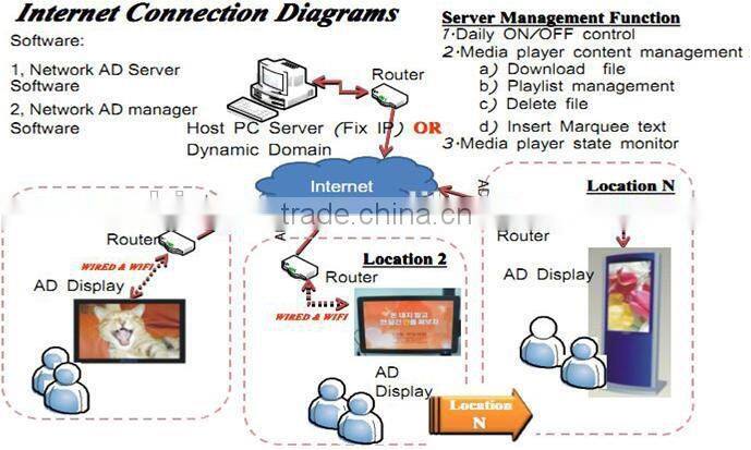 * Can be set split-screen 1to8 area for broadcasting video w/ photo, w/ other display of logo/ date/ weather/ roll-text or subtitles.