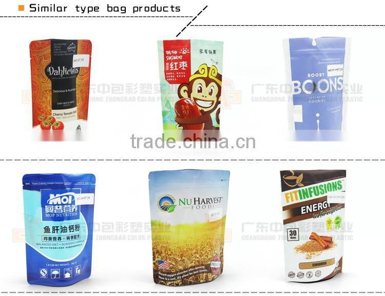 | Bag type: | Three side sealing, back center sealing with or without side gusset, stand up pouch with or without ziplock, stand up pouch with spout, four sides sealing, stand up pouch with bottom gusset, special shape pouch as request |
