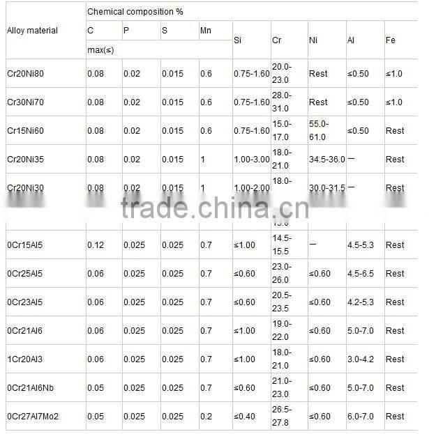 1. FeCrAl heating wire:OCr27AL7Mo2, OCr21AL6Nb, OCr21AL6, OCr25AL5, OCr23AL5, OCr21AL4, 1Cr13AL4.