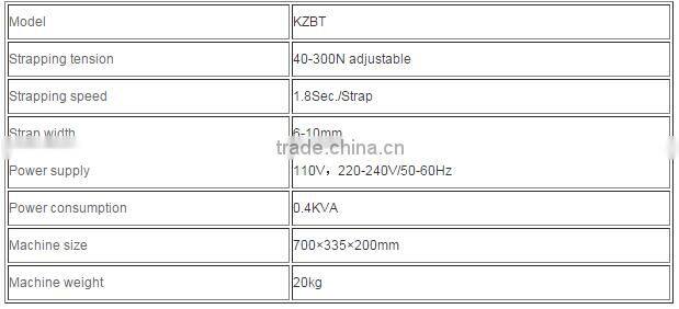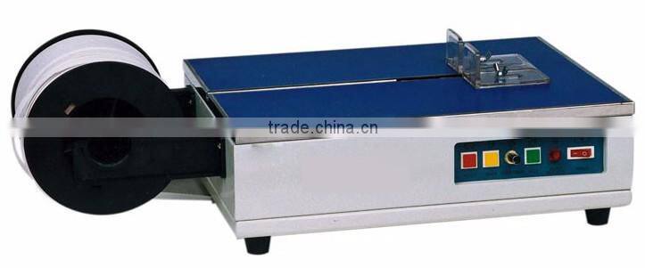table strapping machine is mainly used for strapping and packing small-sized articles such as banknote, instruments, parcels and prints widely used in various trades of finance, post and commerce. The machine is small in size, light in weight, low in noise, rapid in speed and easy in operation, which can be used for adjusting strapping tension as a piece of ideal office equipment.