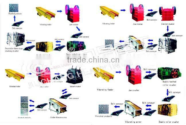 Crushing production line usually consists of vibrating feeder, jaw crusher or fine jaw crusher, impact crusher, double toothed roll crusher, double roller crusher, quad roller tertiary crusher, hammer crusher, belt conveyor, electric control systems and other equipment.