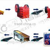 First, put bulk material into the hopper, then the material evenly sent by the vibrating feeder into jaw crusher for primary crushing. Second, the material be sent into the fine jaw crusher by a belt conveyor for secondary crushing. Third, broken pieces of the material be conveyed to roll crusher for fine crushing, broken material sent by the belt conveyor into vibrating screen for separation, size that meet technical standards will be transported out by belt conveyors, size that failed to the requirements will be sent back to the roller crusher for further crushing, until they reach the standards.