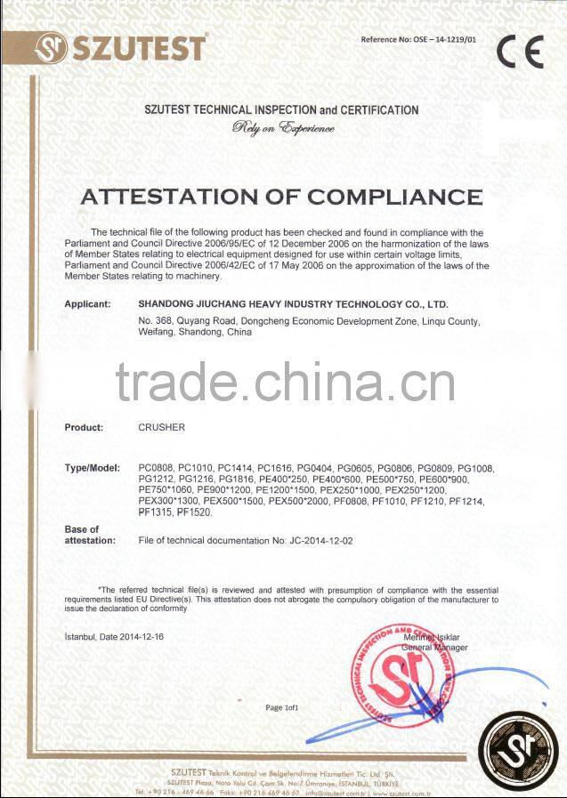 Jiuchang Heavy Industry has passed ISO9001:2008, all of our products with CE certificate.