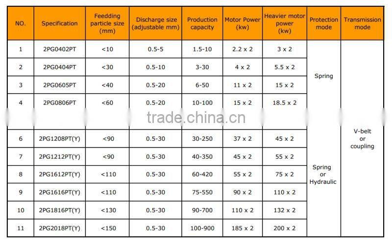 1.Method of definition(2PG1008PT(Y)): 2 means two roller; P means crusher; G means roller; 10 means roller diameter(1000mm); 008means roller width(800mm); P means flat roller ; T(Y) mean spring(hydraulic) protection.