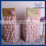 CH029A1 Hot Sale Blush Pink and Gold Ruffled Wedding Chiavari Chair Covers With Flower