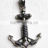 Stainless Steel Pendant- Bright Finish Navy Anchor With Black Wash Rope Around and Clear Gem at the Bottom