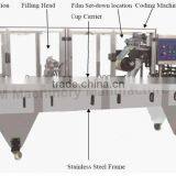 Automatic Cup Filling and Sealing Machine has different kinds of filling pump to fit for filling the products with different viscosity, from beverage to creamy products, like Noodle, Gel, Jelly, Milk, Popsicle, Cream, Fruit Juice, etc., and sealing with appropriate compound film, and it is widely used in cosmetic, medical, chemical industry.