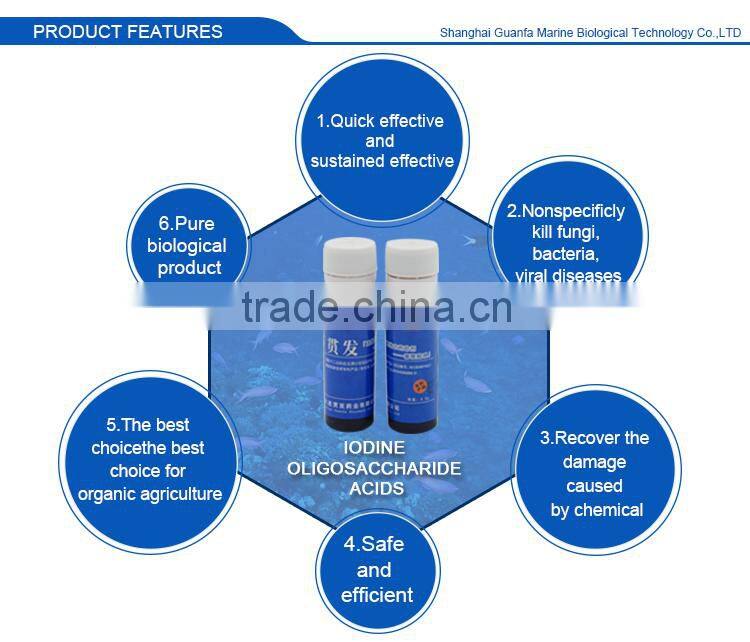 Iodine Oligosaccharide Acids is producedby Shanghai GuanFa Marine biological technology co., LTD. through advanced biological chemical technology ,by compexation Oligosaccharide with Iodine, based on the theory that atomic oxidation protein denaturation inactivation principle and the theory of plant induced disease resistance,the product is a new generation of nonspecific devastation of plant induced resistance. The product solve the problem of the first genaration of oligosaccharins, such as slow effectivity and further strengthen the product on crops quick result and immunity-inducing activity.