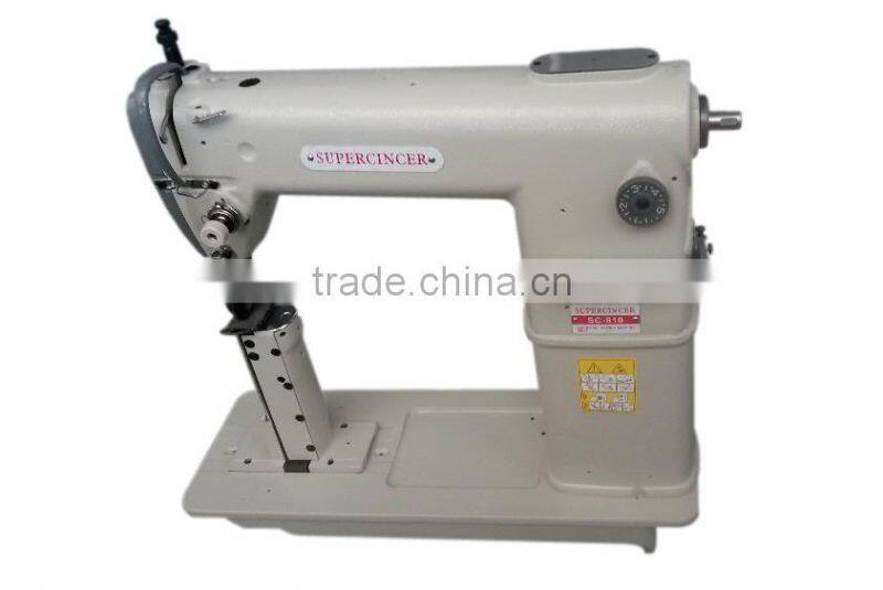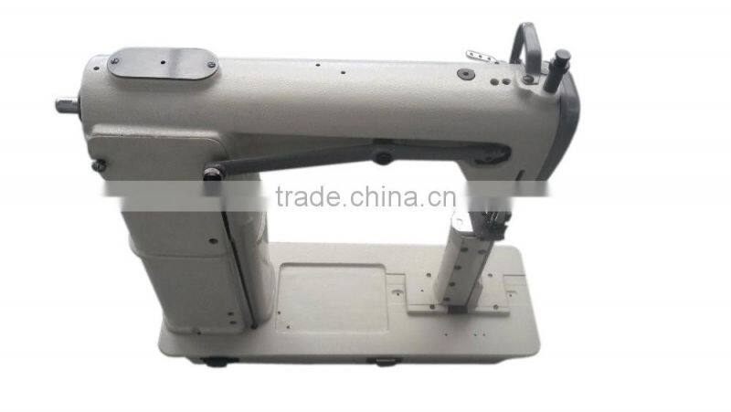 It adopts single straight needle, jampan-aligning thread, and vertical rotating spindle hook threads to form double-thread lock stitches. The upper and lower axis adopts spiraling bevel gear, cylindrical seaming stand and rolling press foot, which is convenient for vertical and zigzag seaming. Applicable to the corner seaming of leather shoes, sports shoes and leather bags.
