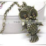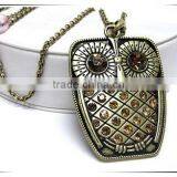 Crystal Stud Antique Metal Owl Pendant Long Chain Necklace