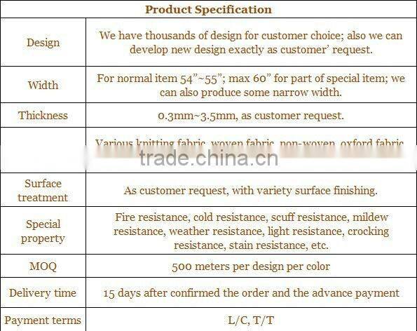 | Use | Home Textile, Decorative, Belt, Chair, Golf, Bag, Furniture, Sofa, Football, Notebook, Gloves, Car Seat, Car, Garment, Shoes | Feature | Waterproof, Elastic, Anti-Mildew, Abrasion-Resistant | |