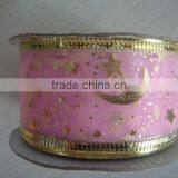 Stars Gold Foil Printed Christmas Ribbon With Wire Pressed Sides