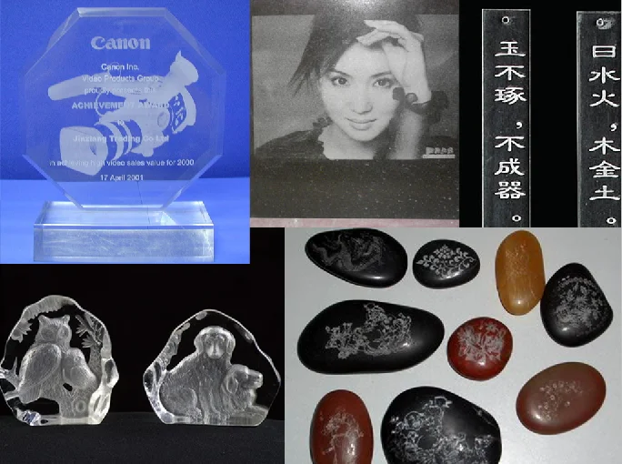 The widely application of marble, jade, leather, paper products, cloth, rubber, ceramics, organic glass, crystal, double color plate, wood products, glass and other materials carved designs.