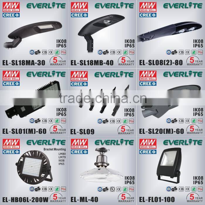 EL-SL09 series is Everlite 2013-2015 most popular model in LED outdoor lighting market. EL-SL09MINI could be made from 10W-30W. We supply 3/5 years warranty. This LED street light is equipped with high quality COB/Multiple-LED, delivering 100lm/w, and high-end driver.