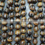 12mm Natural Round Yellow Tiger Eye Carved White 7 Sanskirt Letter Beads for Jewlery