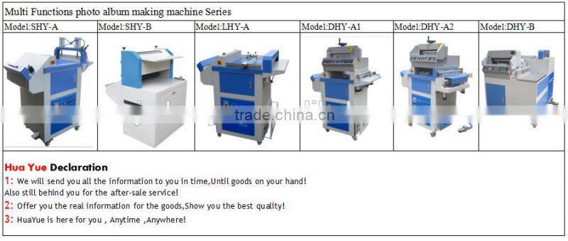 1. This Huayue famous brand 3 in 1 machine includes flattening ,creasing and trimming for album 2. Temperature uniform and shorten the drying time 3. Not to change the album's shape 4. Adjustable pressure 5. Small space , contineous ,operation ,increasing efficiency 6. Fine pressing marks , not to hurt the photos