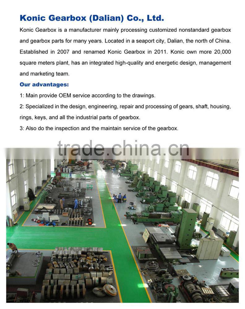 Konic-Gearbox (Dalian) Co., Ltd. is a manufacturer located in the north of China, Dalian City, a international shipping port city, 8 km from the airport, with convenient transportation. Established in 2011, with a more than 20,000 square meters plant, and building area is 3600 square meters, 35 employees right now. Specialized in the design, engineering, repair and manufacturer of gears, shaft, housing, rings, keys, and all the industrial parts of gearbox, crane& lifting reduction gears ect. Meanwhile, Konic gearbox can manufacture the nonstandard parts of gears according to the requirement of customer with drawings. Also do the inspection and the maintain service of the gearbox. Employs experienced technical and management personnel. Also have some profession people who have more than 30 years experience for the gearbox and the machinery processing, like the inspection, the quality control, the operator of the equipment. Make sure the quality and the delivery time of all the orders. Konic Gearbox's products widely used on: Metallurgical, Electric power, Building, Coal, Mining, Lifting, Environmental protection, Chemical, Light industry, Heavy industry, Ship machinery, Printing machinery, Engineering machinery, Wind power energy machinery, New energy etc. Konic Gearbox's domestic customers: Dalian Heavy Industry Group Co., Ltd.; Dalian Huarui Heavy Industry Group Co., Ltd.; Dalian CSIC Industry Group Co., Ltd.; Dalian Rubber & Plastics Machinery Co., Ltd.; Jinan Second Machine Tool Group Co., Ltd. and so on. And also have some customers all around the word, like Italy, Japan, Australia, Qatar, Pakistan, Chile, Singapore, Columbia, England and so on. Konic Gearbox will give you a 24H/7D emergency service, free service quotations, all job dimensions, over 30 year experience let you got a good customer service. From the time of your order arrives at our workshop, you can rest assured in knowing that the job will be project managed, keeping you informed ensures that your project targets will come in on time. Konic Gearbox will give you a competitive price; on time information of the orders such as processing status, goods packing and other information; High quality products; on time delivery, suitable transportation, best after-sale service.