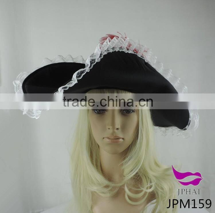 Black Pirate of the Caribbean Hat Triangle Pirate Hat White Lace and Feathers
