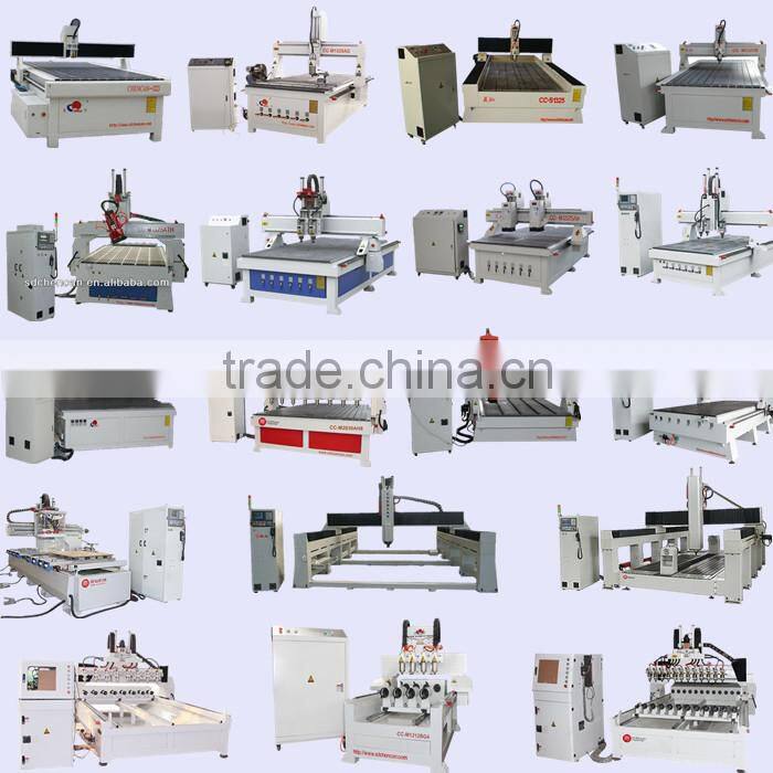 Standard Feature: 1. Whole machine is welded with thick seamless steel structure and heavy loadiing lathe body. Processed by high temperatue tempering treatmen and vibratin stress relief (VSR) to reduce residual stress; Ensure that the stability is excellent, not easy to be deformed. 2. Two function,one is plane table for plane materials cutting and engraving. Another is rotaries for do cylinder/round materials engraving and milling. If you with scanner or designed photo, it ca do any 3d & 2d engraving. 3. Three axes adopt Taiwan imported HIWIN 25 big square guiding rail; XY axes adopt rack and pinion transmission (incline), fast working, hig efficiency and low cost; Z axis adopts Germany imported ball screw, with high precision and long life time. 4, Adopt high-torque YASKAWA servo motors and drives, having steady workiing capability and high positioning precision, with a higher working speed. 5. T-slot working table, fix the work piece by clamps easy to operation. 6. Shanghai Real 4 axis NC Studio system, operated with the computer, convenient operation. 7. 8 pcs China water cooling 2.2kw spindle, which with big power and high speed 24000rmp. 8. Well compatibility: CAD/CAM designing software e.g Type3/Artcam/Castmate/Wentai etc. 9. Has the function of re-carving after break point and power failure and forecasting process time. 10. Perfect oil-inject system makes maintenance much easier. 11. CC-MS2030K8 model machine is the 3D, 4 axises cnc router machine, with 8 rotaries and 8 spindles, which can work at the same time or independently and every one's max effective working area is 225mm (diameter) by 3000mm (length)