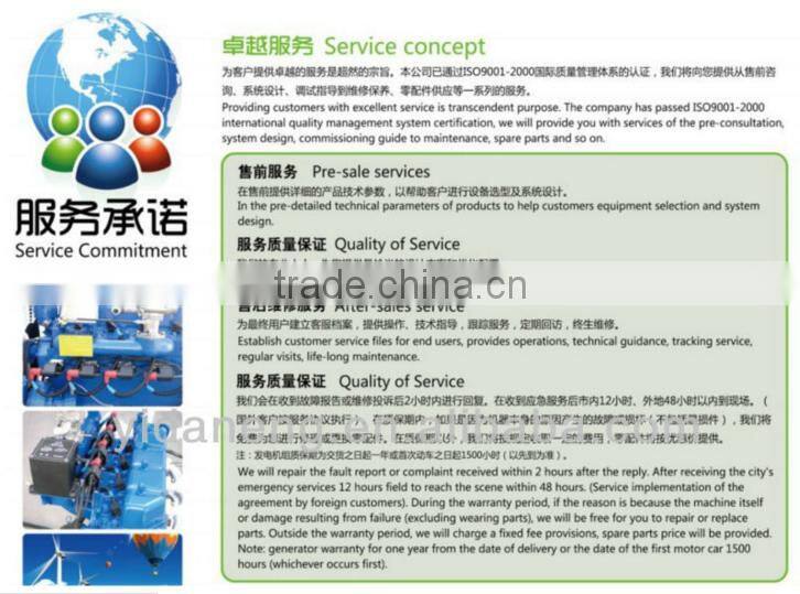 3.Afer-sales Service Establish customer service files for end users, provides operations, technical guidance, tracking service, regular visits, life-long maintenance. Design machine room and the power distribution of generator; Installation and debug the generator; Establish record system and offer follow-up service and regular inspection.