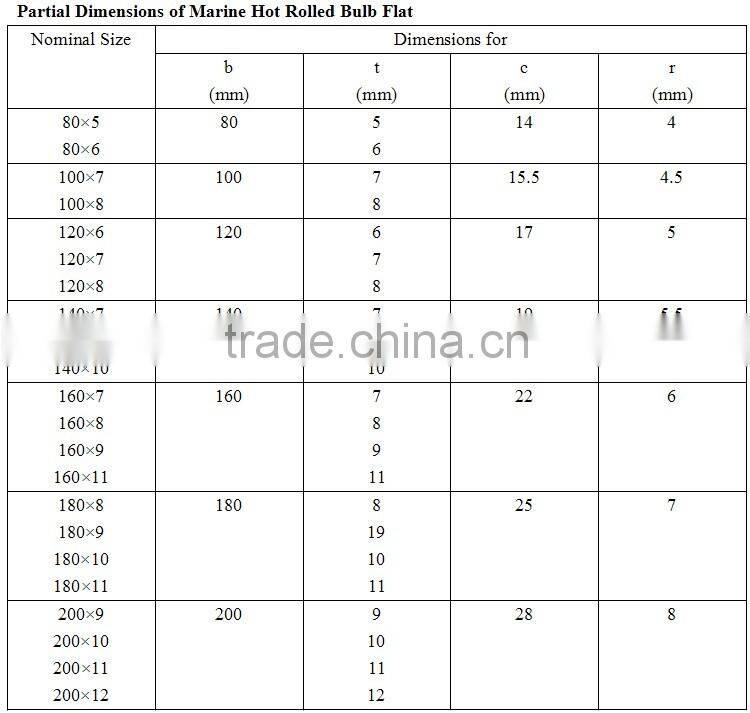 Bulb flat is a kind of steel section with an optimum weight ratio. Marine hot rolled bulb flats are used in shipbuilding as plate stiffeners in different fields of application. Their shape guarantees many advantages compared with other reinforcement solutions: first, bulb flats are the most economical reinforcement for plates; second, they have obvious advantages in strength to weight ratio than other possible reinforcement; their shape reduce welding to minimum during installation... The marine bulb flats are made of marine steel certified by leading classification societies, such as CCS, ABS, BV, LR, GL... The available steel grades are grade A, B, D, E, AH32, DH32, EH32, AH36, DH36, EH36, AH40, DH40, EH40. They are produced by Chinese top steel mills which have mature technology, strict quality management and rich production experience. The bulb flats meet requirements of GB/T 9945-2012 or EN 10067. If you are interested in our hot rolled bulb flats, welcome to contact us. Customization is available.