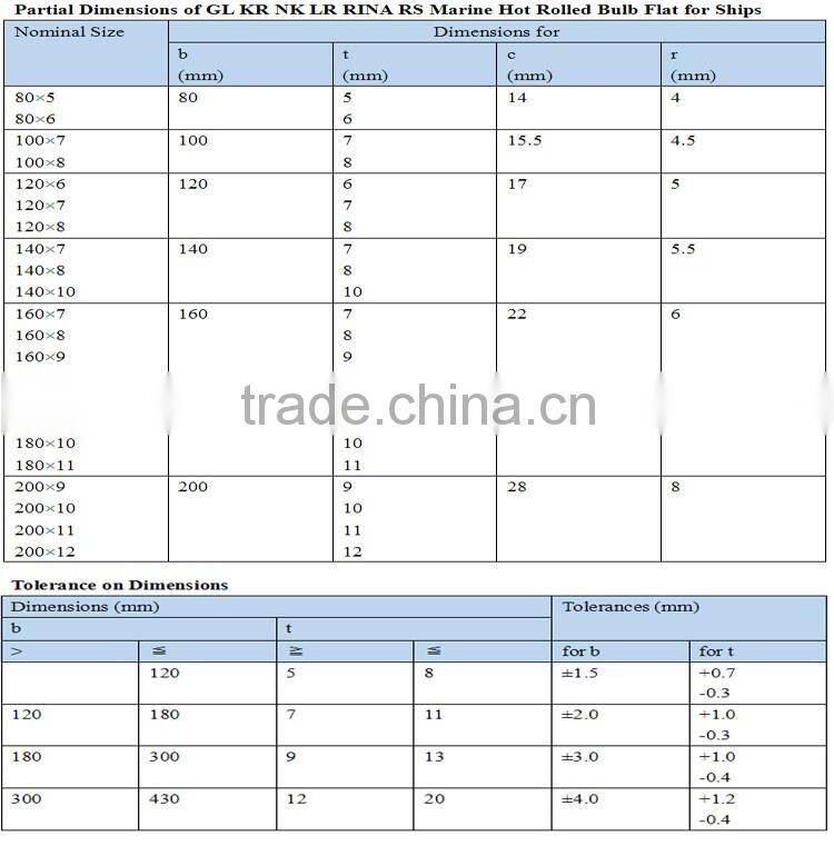 Bulb flats offer signeficent benefits in shipbuilding stiffener applications. Bulb flats provide benefits during the initial steel construction phase, and also during the working life of a ship or other products on which they are used. The bulb flats are economical, efficient and reliable. Because of rounded edges, there is no need for edge grinding before painting, saving time and money. Marine hot rolled bulb flat for ships are produced from steel grades which conform with the requirements of GL, KR, NK, RINA, RS. The steel grades are as bellow: grade A, B, D, E, AH32, DH32, EH32, AH36, DH36, EH36, AH40, DH40, EH40. If you have any specific requirements, we are able to customize products for you. The bulb flats offered are produced by Chinese top steel mills which have earned good reputation. If you are interested in our bulb flats or want to know more details, please contact us.