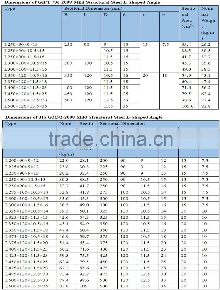 Mild structural steel L-shaped angle is a sort of steel angle made of mild structural steel. The mild structural steel L-shaped angle is also known as “inverted angle”, “unequal leg and thickness angle”. It is often used for large vessels, suitable for both civil ships and warships. In addition to marine purposes, mild structural steel L-shaped angle is also used for building structures, bridges, power transmission towers... We are able to supply L-shaped angle made of various materials. marine L-shaped angle, hot dip galvanized steel L-shaped angle, stainless mild structural steel L-shaped angle. Besides, we also provide you full selection of dimensions. The mild structural steel L-shaped angle is produced by Chinese top mills in line with JIS G3192-2008 and GB/T 706-2008. If you have any specific requirements, please contact us.