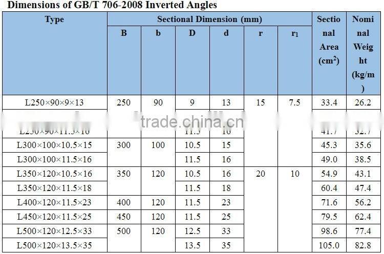 Inverted angles are a sort of steel angles. The inverted angles are also known as “L-section steel”, “L-shaped angles” and “unequal leg and thickness angles”. They are often used for large vessels, suitable for both civil ships and warships. In addition to shipbuilding usage, the inverted angles are also used for building structures, bridges, power transmission towers... Hi-Sea Marine is able to offer inverted angles made of carbon structural steel, alloy steel and stainless steel. Shipbuilding inverted angles, galvanized inverted angles, stainless inverted angles are all available. Besides, Hi-Sea Marine also provides you full selection of dimensions. The inverted angles are produced by Chinese top steel mills in line with GB/T 706-2008 or JIS G3192-2008. If you have any specific requirements, please contact us.