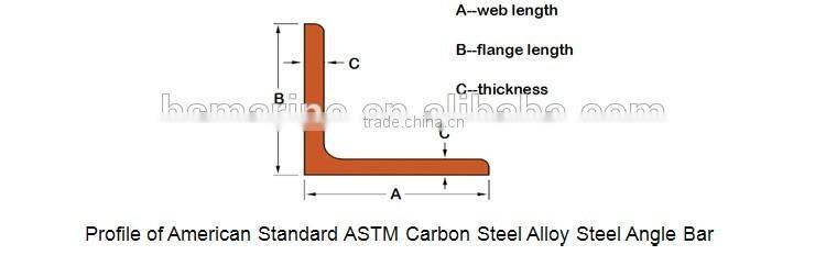 American standard ASTM carbon steel alloy steel angle bar is a kind of steel profiles. It is often used for good structural support, such as shipbuilding, shelves, brackets, trailers, carts... The steel angle bar is manufactured according to the requirements of American Society for Testing Material. The materials are carbon structural steel and alloy steel.