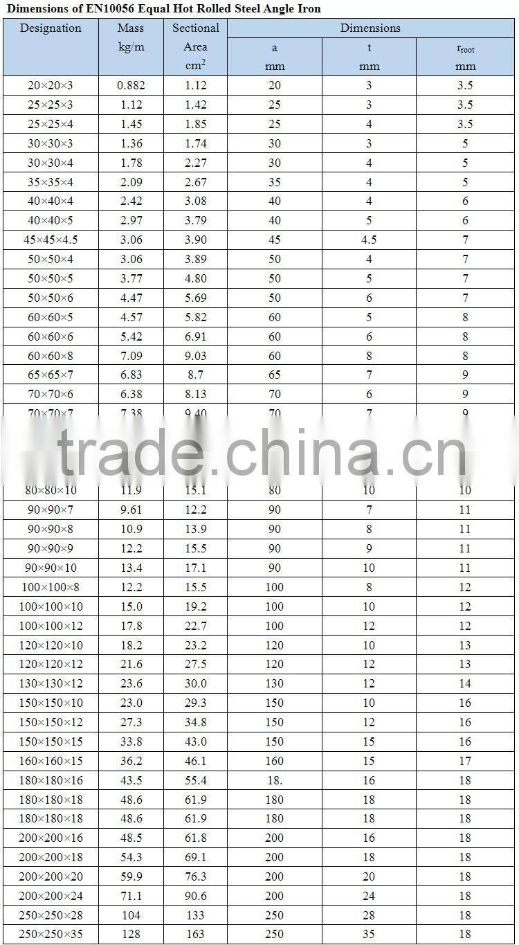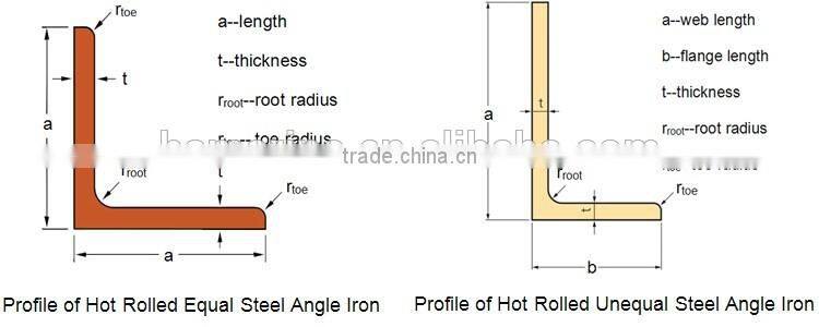 The steel angle iron is one of steel profiles which are used for shipbuilding, bridges, buildings and so on. The angle iron is also called “L shape”. We are able to provide three types of angle iron: equal leg angle iron, unequal leg angle iron and unequal leg and thickness angle iron. The materials of the hot rolled steel angle iron include BVA, CCSA AB/AH32, S185, S235JR, S235J0, S235J2, S275JR, S355JR... For the angle iron made of marine steel, we are able to provide the certificates from leading classification societies. Excepting hot rolled steel angle iron, we also supply Chinese standard steel angle iron, Japanese standard steel angle iron, American standard steel angle iron, stainless steel angle iron, galvanized steel angle iron, marine steel angle iron... If you are interested in our products, welcome to contact us!