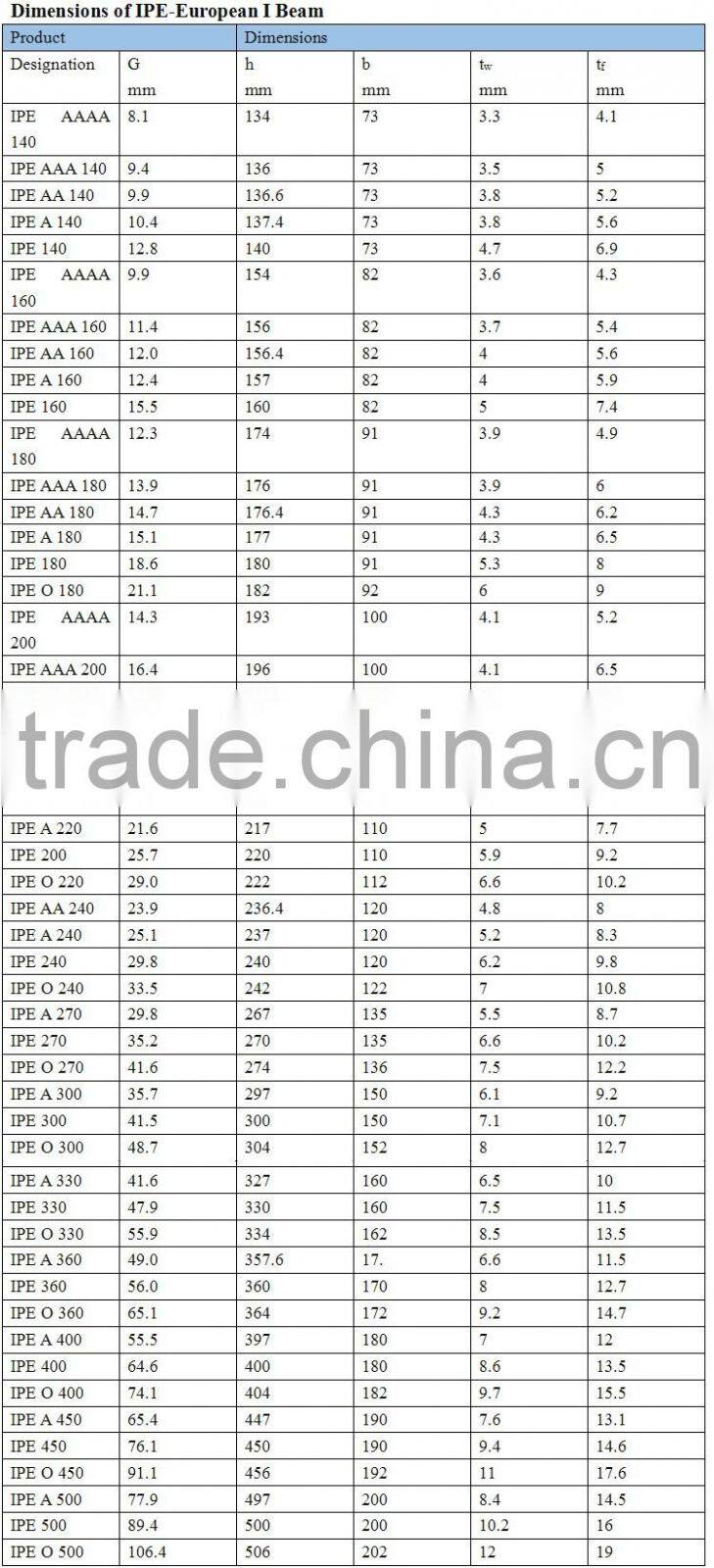 The IPE-European I beam provided is a kind of hot rolled steel profile which is manufactured according to European standards EN 10034 and EN10025. IPE-European I beams are also called “H-beams”, “H-sections”, “steel W section I-beams” and “wide flange sections”. They are used across a wide range of structural applications from big buildings to ships. IPE-European I beams feature excellent mechanical properties, rational profiles, and less internal stress. Besides, they are standard-sized, well shaped and reliable. We are able to supply the beam height in the range of 140~500mm. The available steel grades are S235J0, S235J2, S235JR, S275JR, S275J0, S275J2, S355J0, S355J2, S355JR, S355J2+N. If you have any specific requirements or want to know more details, welcome to contact us. We will try our best to fulfill your requirements.