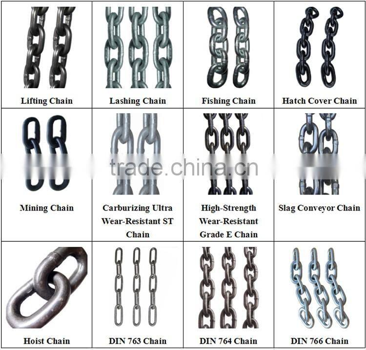For link chains, we provide lifting chains, lashing chains, log boom chains, G30/G43/G70/G80/G100 chains, NACM1980/1990/1996/2003 standard link chains, DIN 763/DIN764/DIN766/DIN5684/DIN5685 chains, Australian standard chains, Japanese standard chains, Korean standard chains, chains with hooks...