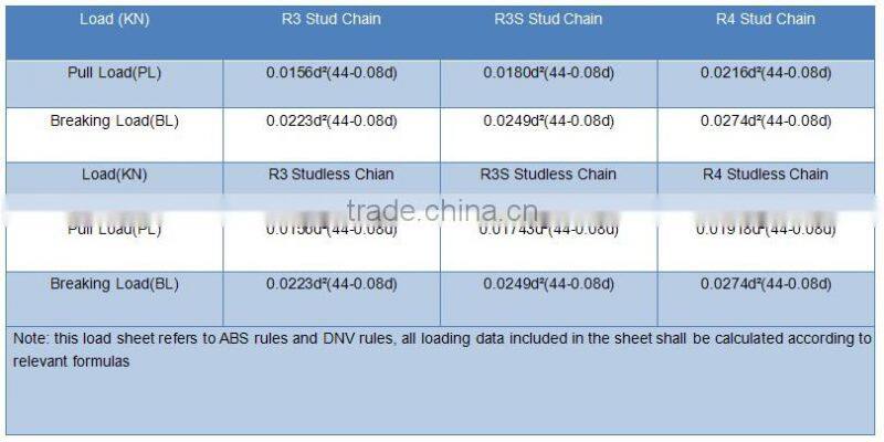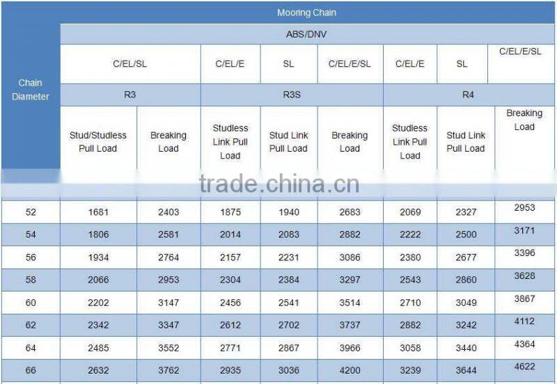 ABS,DNV Mooring Chains Metric Load Sheet(Chain Dia. Unit: mm; Load Unit: KN)