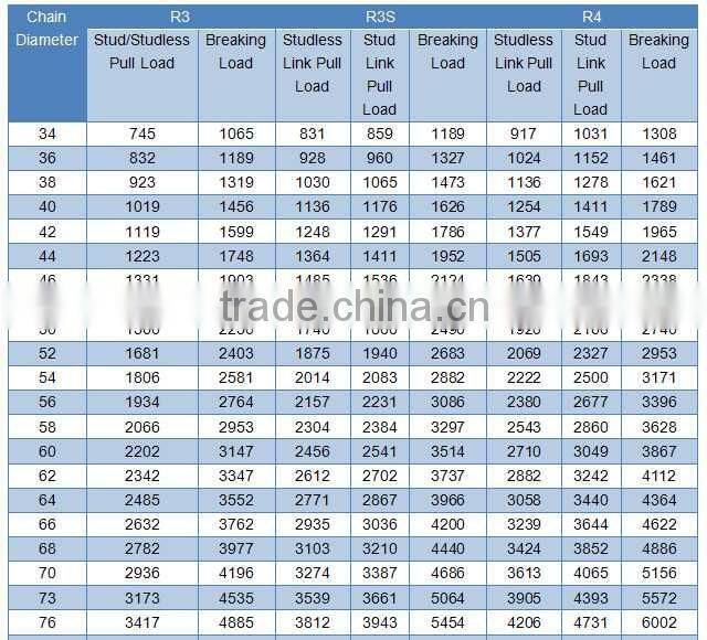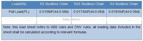ABS,DNV Mooring Chains Metric Load Sheet(Chain Dia. Unit: mm; Load Unit: kN)