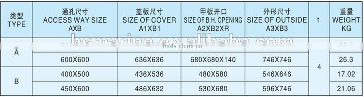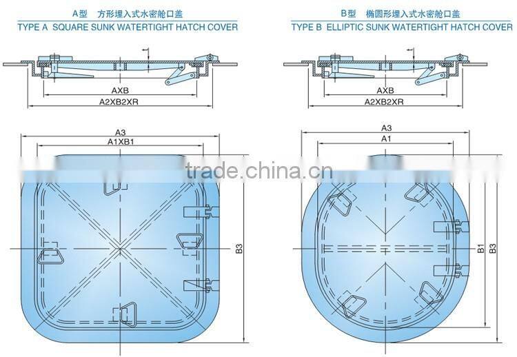 There are two types of the aluminum sunk watertight hatch cover: type A is square, type B is elliptic. We can customize products according to your requirements. All products we provided are with high quality. We also supply other hatch covers, for example, weathertight hatch cover. If you are interested in our products, please contact us for more information.
