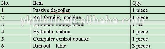 Normal manual De-coiler (5T); Main machine of roll forming; Hydraulic forming cutting; Hydraulic station; PLC computer operation cabinet; Run-out  table