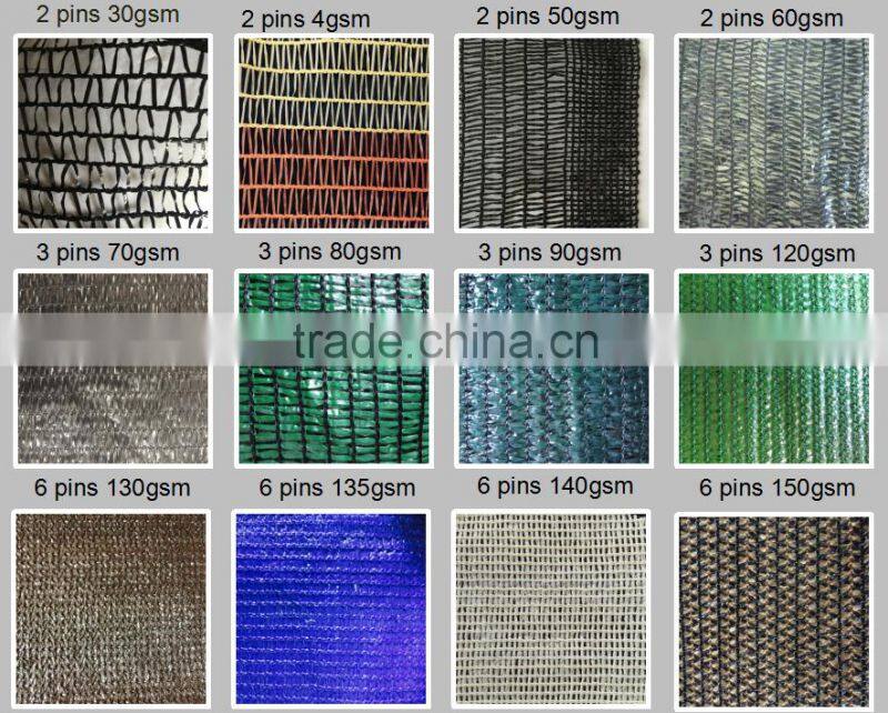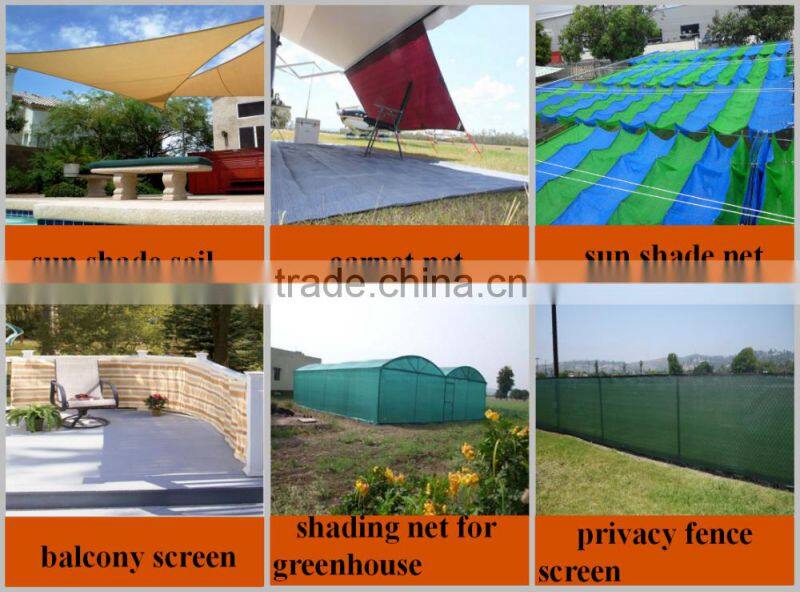sun shade net are kintted HDPE(high density polyethylene) with 3% UV,30-350g per square meter, is ideal for use on all kinds of places such as greenhouse, residential Roof, outdoor work place,outdoor sun shade(sun shade sail),windows(window blinds),balcony(balcony screens),wire fence (privacy fence windscreen),parking lot(carport)and many more.