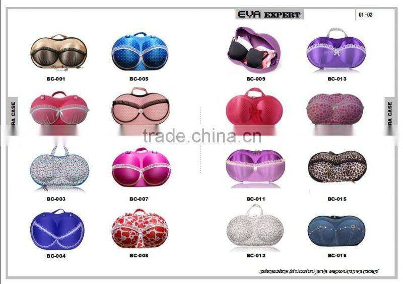 1.Our EVA bra storage case& bra bag can use satin fabrics,PU,all kinds of nylon cloth and knitted fabric as shell fabric,main ingredient is EVA,by a special process, finalize the design,to provide perfect protection of your products,Provide waterproof, prevent pressure, security, wear-resisting, and other functions