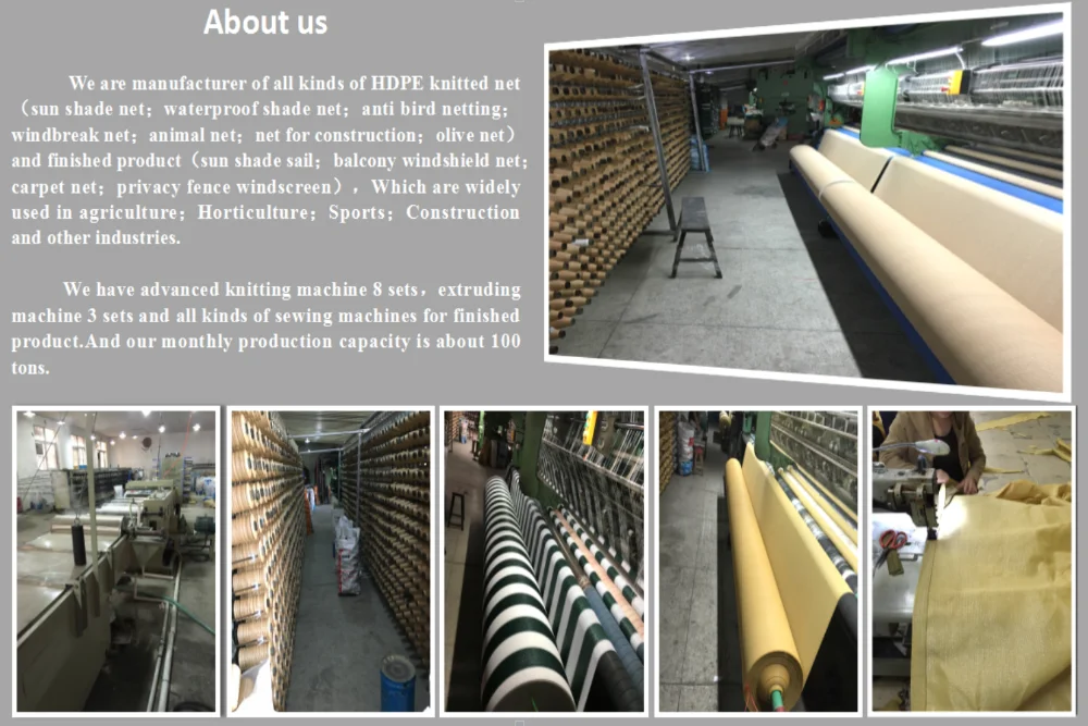 sun shade net .shade sail. safety debris netting. fence screen /windbreak net .window blinds.camping carpet net.balcony cover. olive net . anti-bird net. anti-hail net. anti-animal net. PP/PE weed control mat. etc.