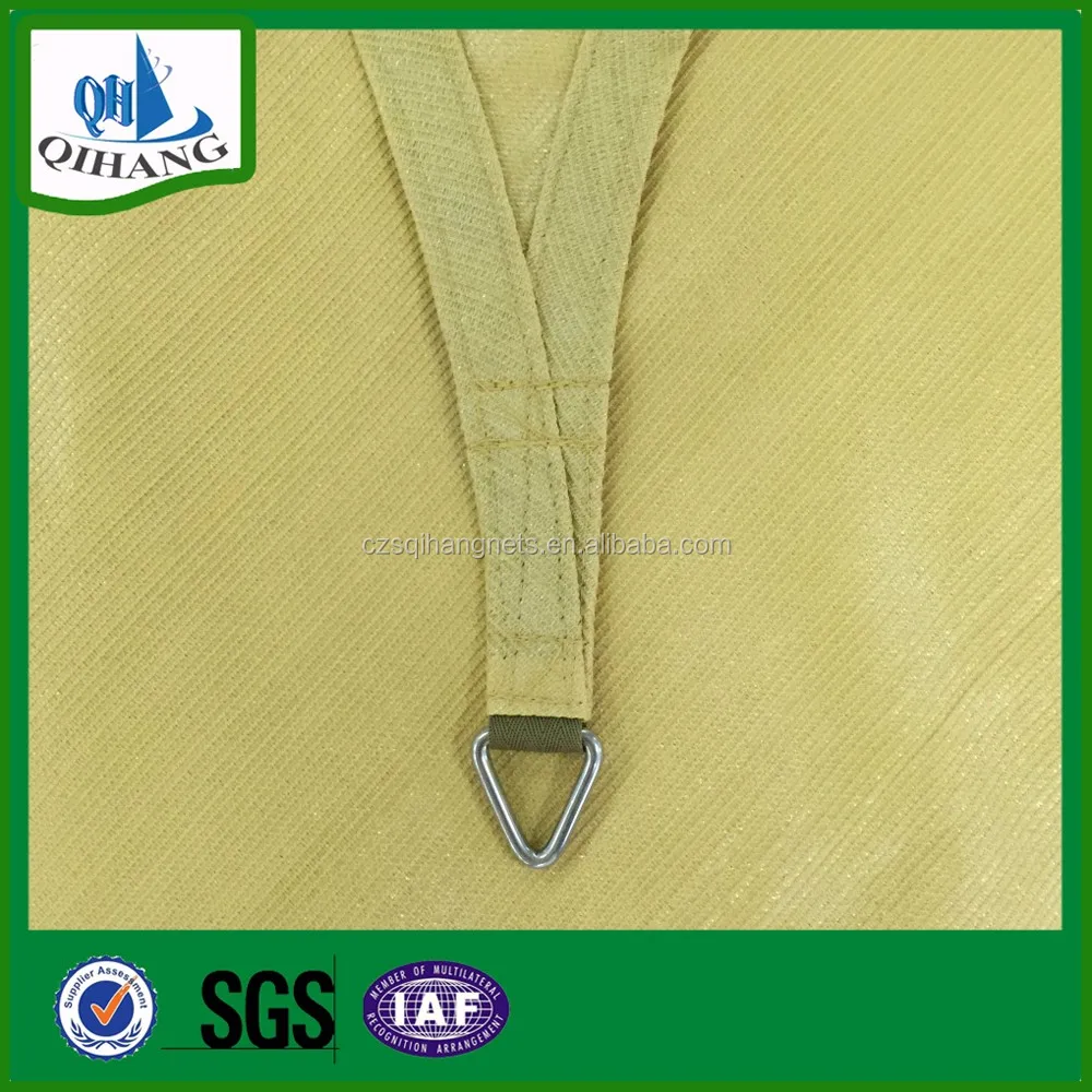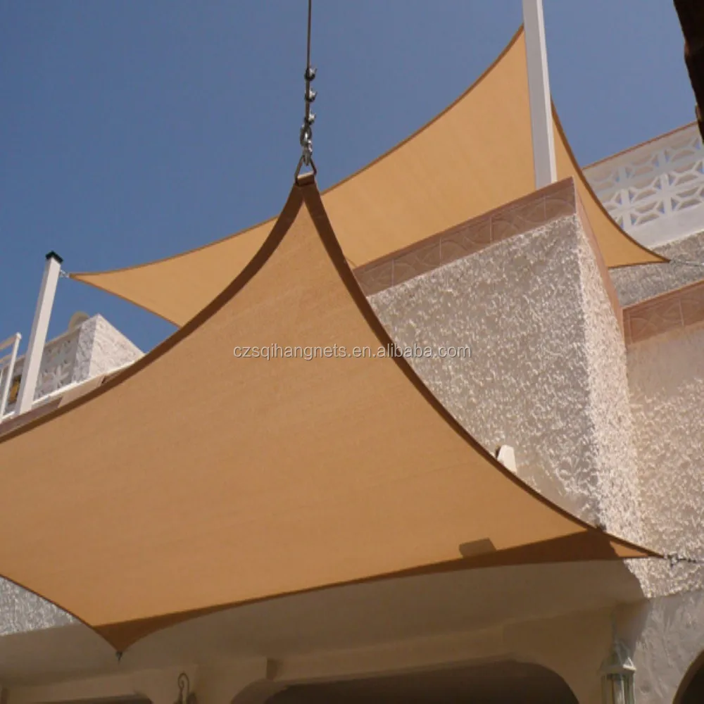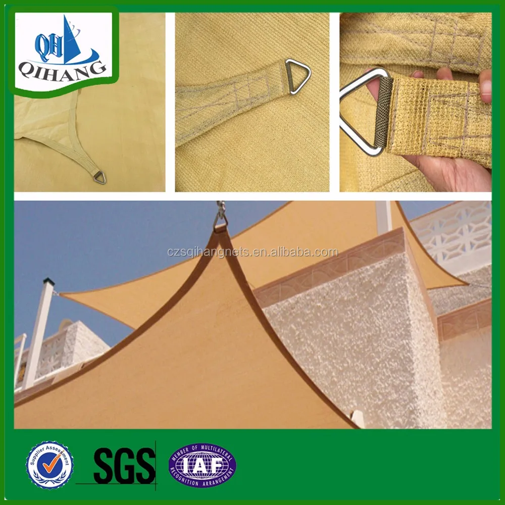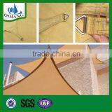 sun shade sail are constructed of high density polyethylene knitted fabric.Sewn thought the entire perimeter for extra strenth webbing and we use stainless steel "D" or triangle stainless rings in eachcorner,our shade sails are made of a high rated UV blocking fabric and are sewn with double rows of locking stitches.The cloth is a high density polyethylene knitted fabric that extremely durable and lasts for years in direct sun.Extra wide fabric is used so there are no seams.Gentle curves along the edges allow for proper tension distribution.