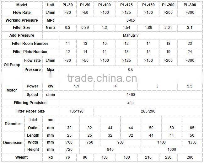 PL series plate pressure oil purifier is designed for power station, electricity factory, mineral enterprise, lube depot, tractor station, petroleum, chemical engineering, metallurgy, national defense unit etc. for filtering water and impurities of transformer oil, turbine oil, engine oil, diesel oil, kerosene, aviation hydraulic oil as well as edible oil while using stainless steel. The machine is made up of filter bed, oil pump and rough filter. There are filtering media such as filtering paper or filtering fuse, installed