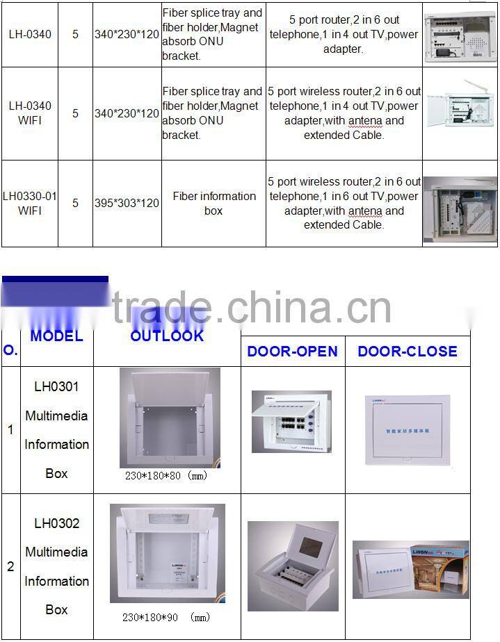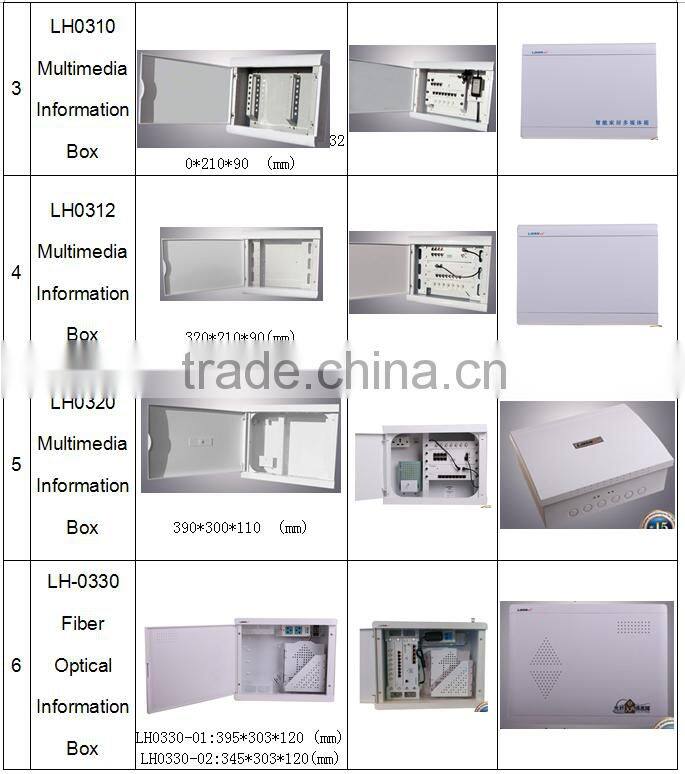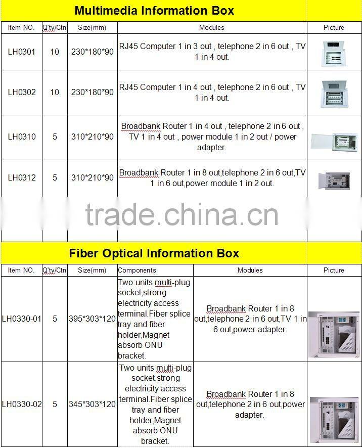 Multimedia information box is a new smart box integrated of intelligent line system .It is widely used in connection and allocation of line for home broadband,office broadband,hotel . Broadband , telephone , computer, television, audio,monitor,switch,power etc.We have more than 35 modules for choices.