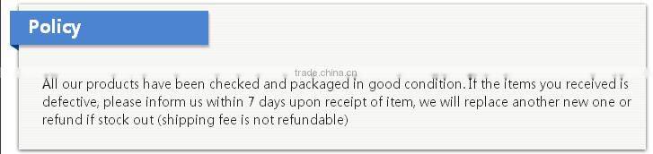 | Shipping | 1.Samples&small quantity by DHL,FEDEX,TNT 2.Bulk orders by sea |