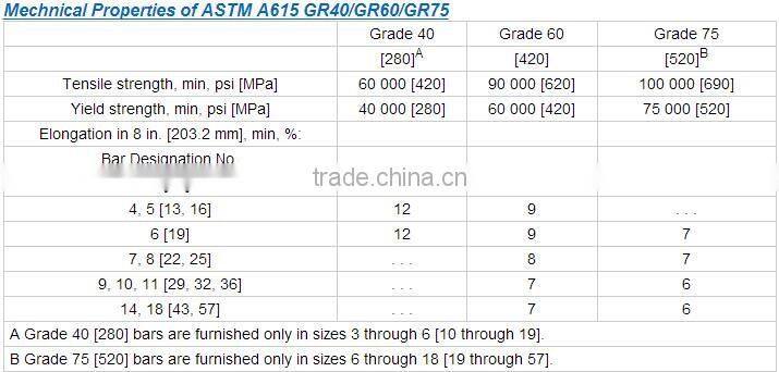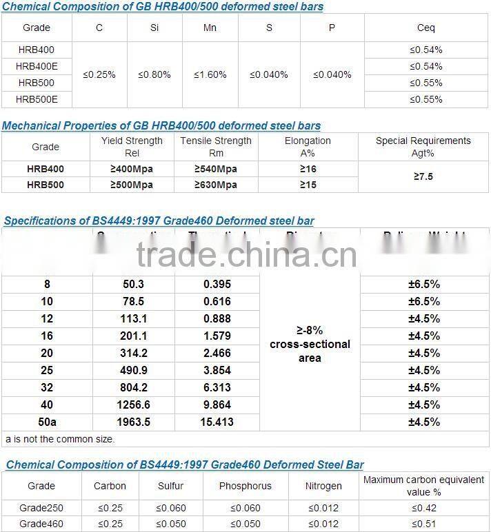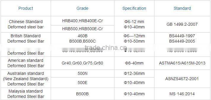 Steel Grade: HRB400 HRB500 BS4449 Grade460 Grade500 ASTM A615 GR40 GR60 GR75