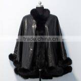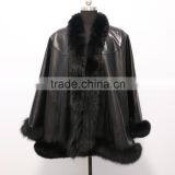 2016 New Design Women Real Black Leather Poncho With Fox Fur Trim Poncho